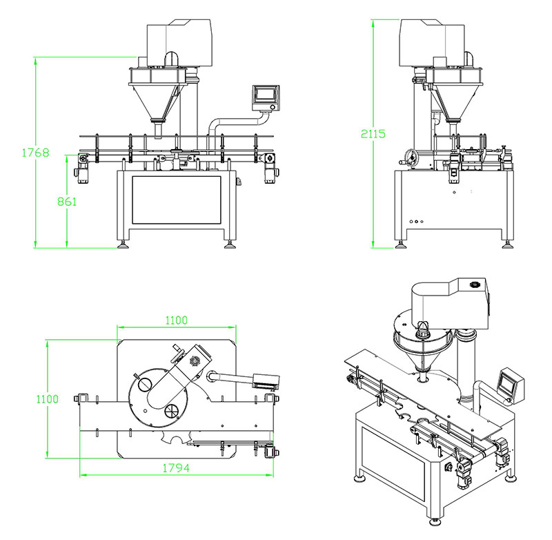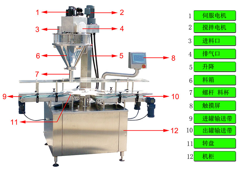 該系列罐裝機能完成喂罐、托罐、充填計量、稱重選別等工作,可與其它設備配套組成整套罐裝流水線,適用于充填眼影粉、閃粉、胡椒粉、辣椒粉、奶粉、米粉、蛋白粉、豆奶粉、雞粉、咖啡粉、藥粉、添加劑、香精香料等。