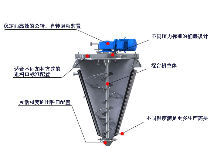 結構特點:螺帶式混合機,由單級減速機(無級變速)、傳動部分、筒蓋、筒體、內螺旋、外螺帶、出料閥等部件組成。設備設有多種樣式(刮板、內螺旋、外螺帶),也可以雙錐體結構,適應不同物料,適應高粘度的流體物料混合。螺帶式混合機,它是攪拌粘性流體或稠狀、濕狀、膏狀為主,也可以混合粉體。顆粒的物流,本機較廣的用于粘合劑,硅橡膠,染料,顏料,油墨,石蠟,油漆,樹脂,雪花膏,藥膏,洗滌劑,洗衣粉,食品添加劑,奶粉,食鹽,味精,巧克力,飼料,生物肥,新型建材等領域。
